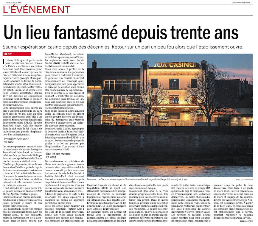 C’est un fait, les Saumuroises et les Saumurois font preuve d’opiniâtreté. Et quand ils tiennent une idée, ils ne la lâchent pas… Il en est ainsi du projet de casino que Saumur inaugure le 26 mars 2026, suite à l’aval donné par les députés au mois de décembre 2023.