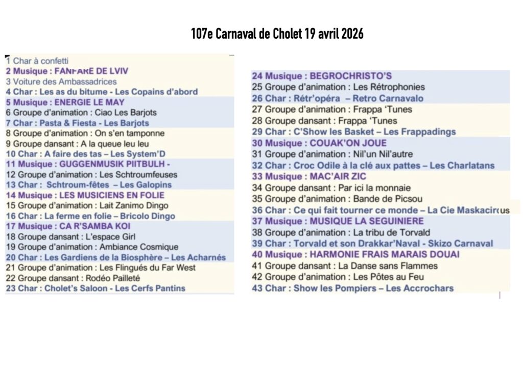 Du 19 au 25 avril 2026, suivant un itinéraire inauguré en 2025, le 107e Carnaval anime la ville de Cholet. Le Courrier de l’Ouest évoque 80 mille spectatrices et spectateurs.