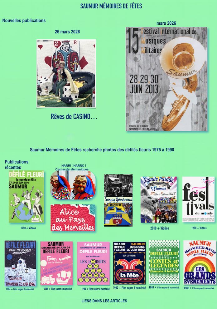 Saumur – En préambule des rétrospectives des défilés fleuris 1986, 1988 et 1990, Saumur Mémoires de Fêtes présente les bilans, les projets, les programmes du Comité des fêtes des années 1985 à 1990.