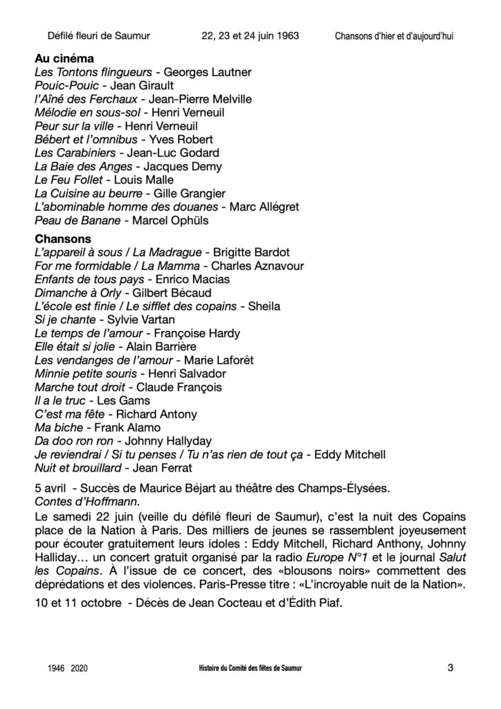 Si dans un album, un tiroir ou un grenier vous avez connaissance de photographies de ce défilé fleuri 1963, en particulier l’incendie du char Les Lavandières du Portugal, merci de prendre contact avec la rédaction dans « Laissez un commentaire » ou sur la page Facebook « Saumur Mémoires de Fêtes ».